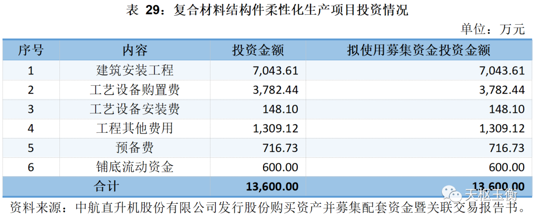 復(fù)合材料結(jié)構(gòu)件柔性化生產(chǎn)項(xiàng)目主要圍繞某型直升機(jī)復(fù)合材料結(jié)構(gòu)件研制及批產(chǎn)任務(wù)要求,重點(diǎn)補(bǔ)充復(fù)合材料鋪貼、復(fù)合材料熱加工、復(fù)合材料打磨、復(fù)合材料機(jī)械加工等相關(guān)條件。通過本募投項(xiàng)目建設(shè),將進(jìn)一步夯實(shí)直升機(jī)復(fù)材結(jié)構(gòu)件核心關(guān)鍵制造技術(shù),切實(shí)提升復(fù)材結(jié)構(gòu)件研制生產(chǎn)能力,滿足各型直升機(jī)復(fù)材結(jié)構(gòu)件成套批量交付需求,滿足某型直升機(jī)復(fù)材機(jī)身結(jié)構(gòu)研制任務(wù)需要。項(xiàng)目總投資金額為13,600.00萬元,擬使用募集資金金額為13,600.00萬元,具體情況如下:
