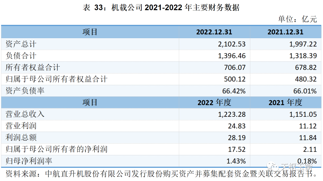 機(jī)載公司是我國航空電子、飛行控制、機(jī)電等航空機(jī)載設(shè)備的主要供應(yīng)商,以軍民機(jī)及安全防務(wù)用系統(tǒng)、設(shè)備與專用元器件的技術(shù)發(fā)展、研發(fā)生產(chǎn)、維修及服務(wù)保障為核心,并從事基于核心技術(shù)衍生的高端裝備、新一代信息技術(shù)、高端車載系統(tǒng)等先進(jìn)制造業(yè)務(wù),形成軍航及防務(wù)、民用航空和先進(jìn)制造業(yè)三大業(yè)務(wù)。公司2021年及2022年的主要財(cái)務(wù)數(shù)據(jù)(合并報(bào)表)如下表所示: