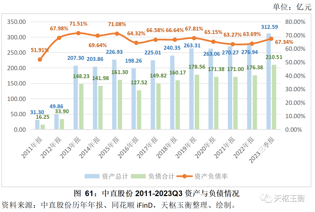 截止2023年三季度末,中直股份總資產(chǎn)312.59億元,負(fù)債總額210.51億元,公司總體資產(chǎn)負(fù)債率67.34%,較2022年年末上漲了3.65個(gè)百分點(diǎn)??傮w來看,中直股份的資產(chǎn)負(fù)債率保持相對平穩(wěn)的態(tài)勢。