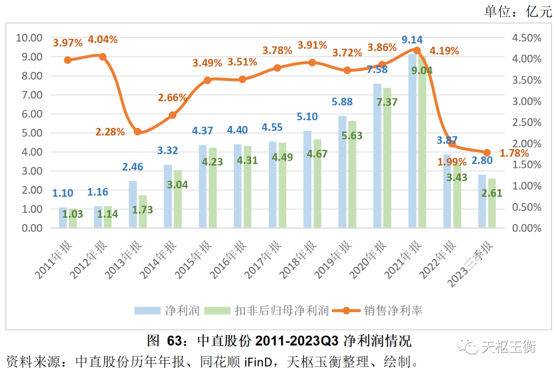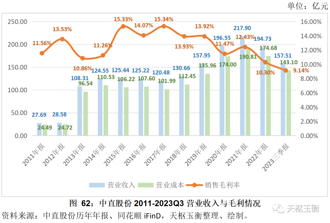 2011年至2022年,中直股份的毛利率均保持在10%以上,2023年前三季度,中直股份總體銷售毛利率為9.14%,為2011年以來的最低谷。