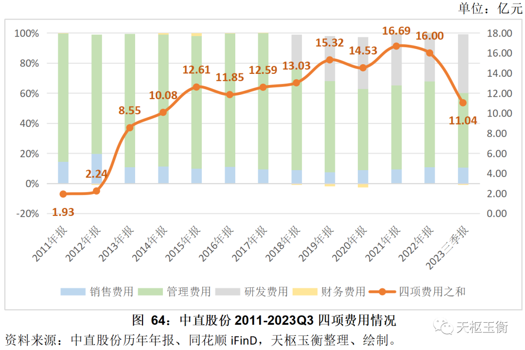 2011-2022年期間,中直股份的四項(xiàng)費(fèi)用之和呈現(xiàn)持續(xù)上升趨勢,2023年前三季度,四項(xiàng)費(fèi)用之和大幅降低,僅為11.04億元。