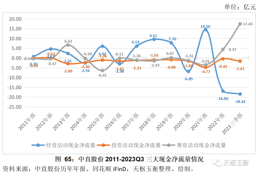 在經(jīng)營活動現(xiàn)金凈流量方面,中直股份近幾年波動較大。2021年全年,中直股份經(jīng)營活動現(xiàn)金凈流入14.50億元,2022年則實(shí)現(xiàn)凈流出近16.86億元,2023年前三季度,公司經(jīng)營活動現(xiàn)金凈流出18.42億元。