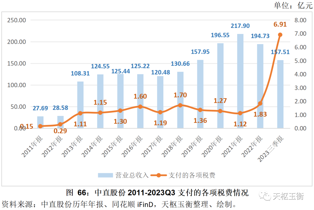 2011年至2023年前三季度,中直股份累計(jì)支付各項(xiàng)稅費(fèi)20.98億元,2013-2022年期間,公司年均支付各項(xiàng)稅費(fèi)1.36億元;2023年前三季度,中直股份即支付各項(xiàng)稅費(fèi)近7億元,占13年來繳稅總額的三分之一。