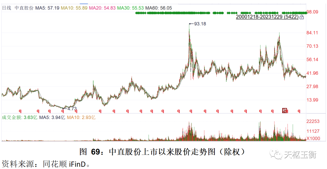 除權(quán)后,中直股份在20155月末,達(dá)到了股價(jià)的最高峰,為93.18/股;截止2023年末,公司股價(jià)收于38.53/股。