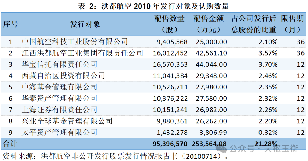 2010年,洪都航空按照26.58元/股的價(jià)格,向中國航空科技工業(yè)股份有限公司、江西洪都航空工業(yè)集團(tuán)有限責(zé)任公司等9名投資人非公開發(fā)行A股股票95,396,570股,募集資金總額為2,535,640,830.60元,扣除發(fā)行費(fèi)用31,630,844.45元后,公司實(shí)際募集資金凈額為2,504,009,986.15元。