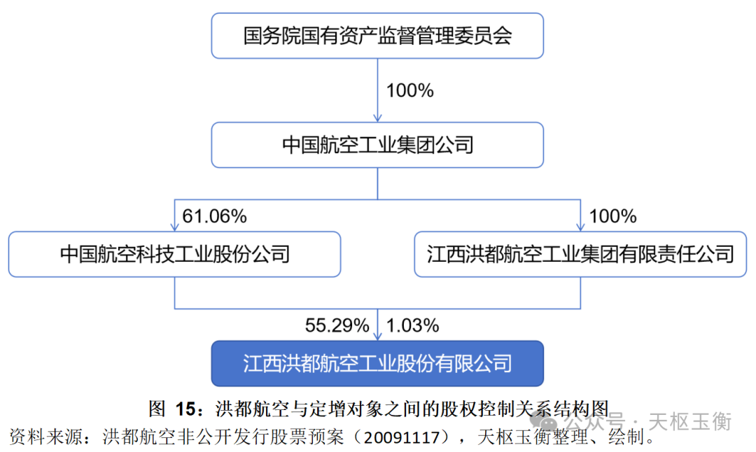 其中,定增對象中航科工是洪都航空的控股股東,洪都集團(tuán)亦為洪都航空關(guān)聯(lián)方,三家公司之間的股權(quán)控制關(guān)系結(jié)構(gòu)圖如下:
