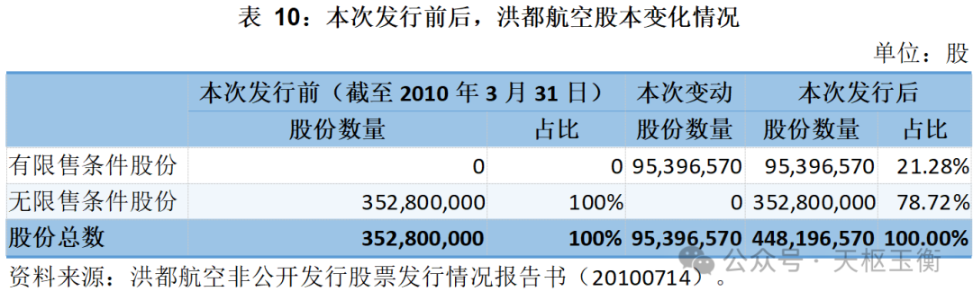 在總股本方面,本次發(fā)行前,洪都航空總股本為3.528億股;本次發(fā)行后,洪都航空增加了95,396,570股優(yōu)先受條件股份,總股本達(dá)到了4.48億股。