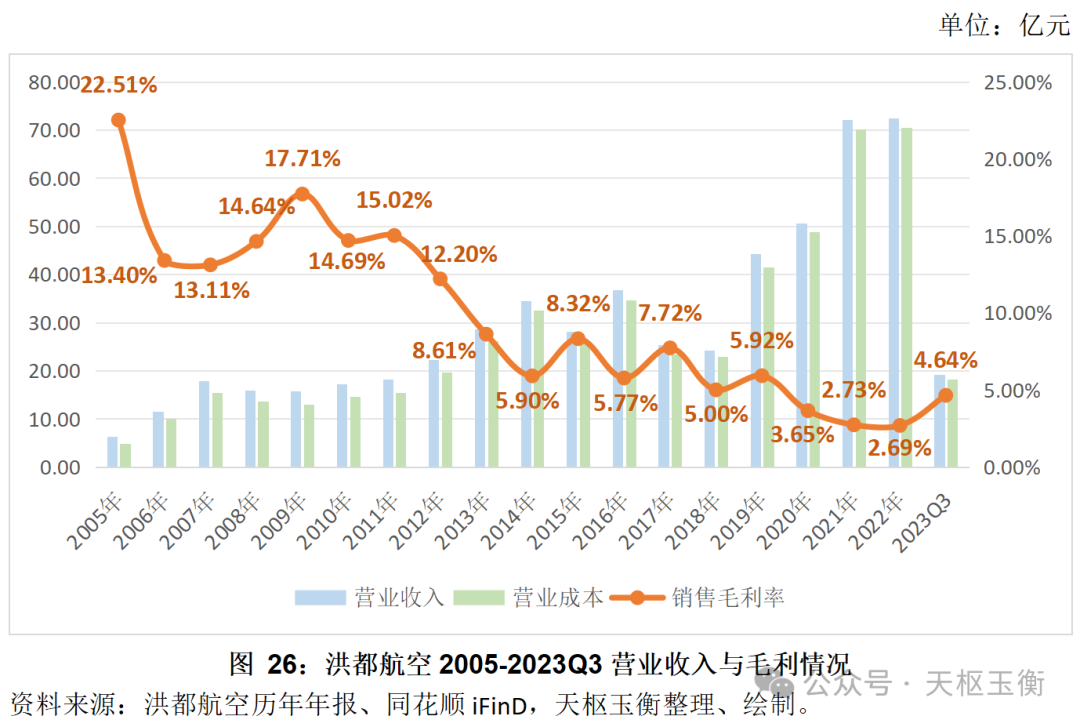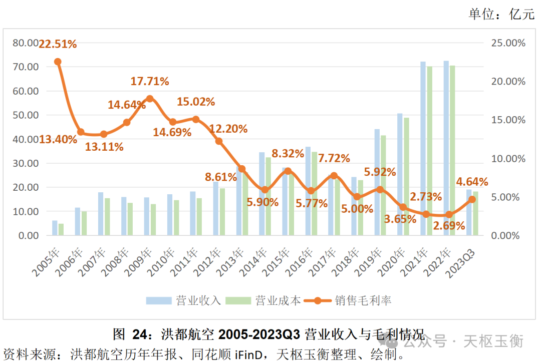 2005年至2023年三季度,洪都航空的毛利率逐年下滑。