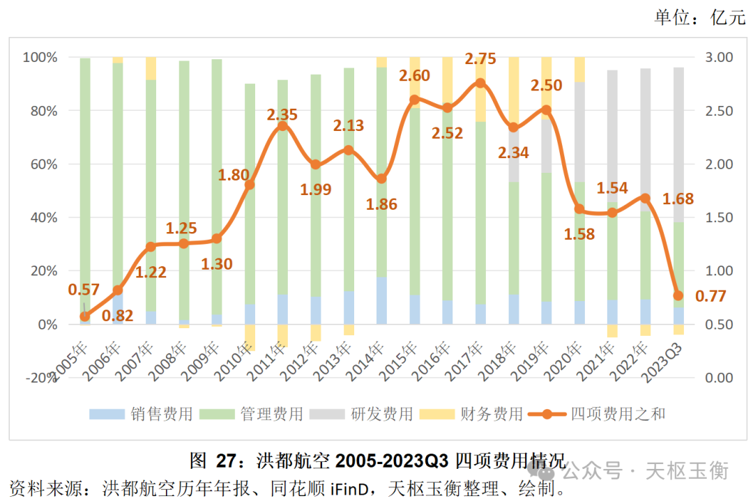 2011-2019年期間,洪都航空的四項(xiàng)費(fèi)用之和保持在2億元上下,2020-2022年,四項(xiàng)費(fèi)用之和下降至1.5億元左右;截止2023年前三季度,四項(xiàng)費(fèi)用之和大幅降低,僅為0.77億元。