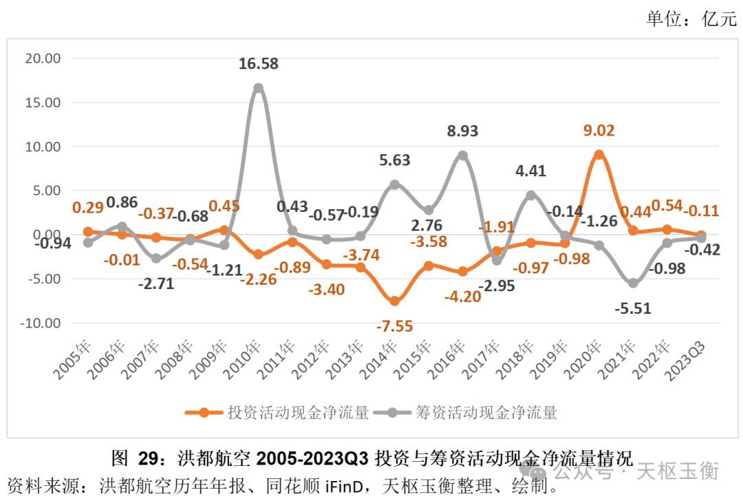 相比經(jīng)營活動現(xiàn)金凈流量的大幅波動,除2021年公司投資產(chǎn)生的現(xiàn)金凈流入9.02億元外洪都航空投資活動產(chǎn)生的現(xiàn)金凈流量則相對平穩(wěn)。
